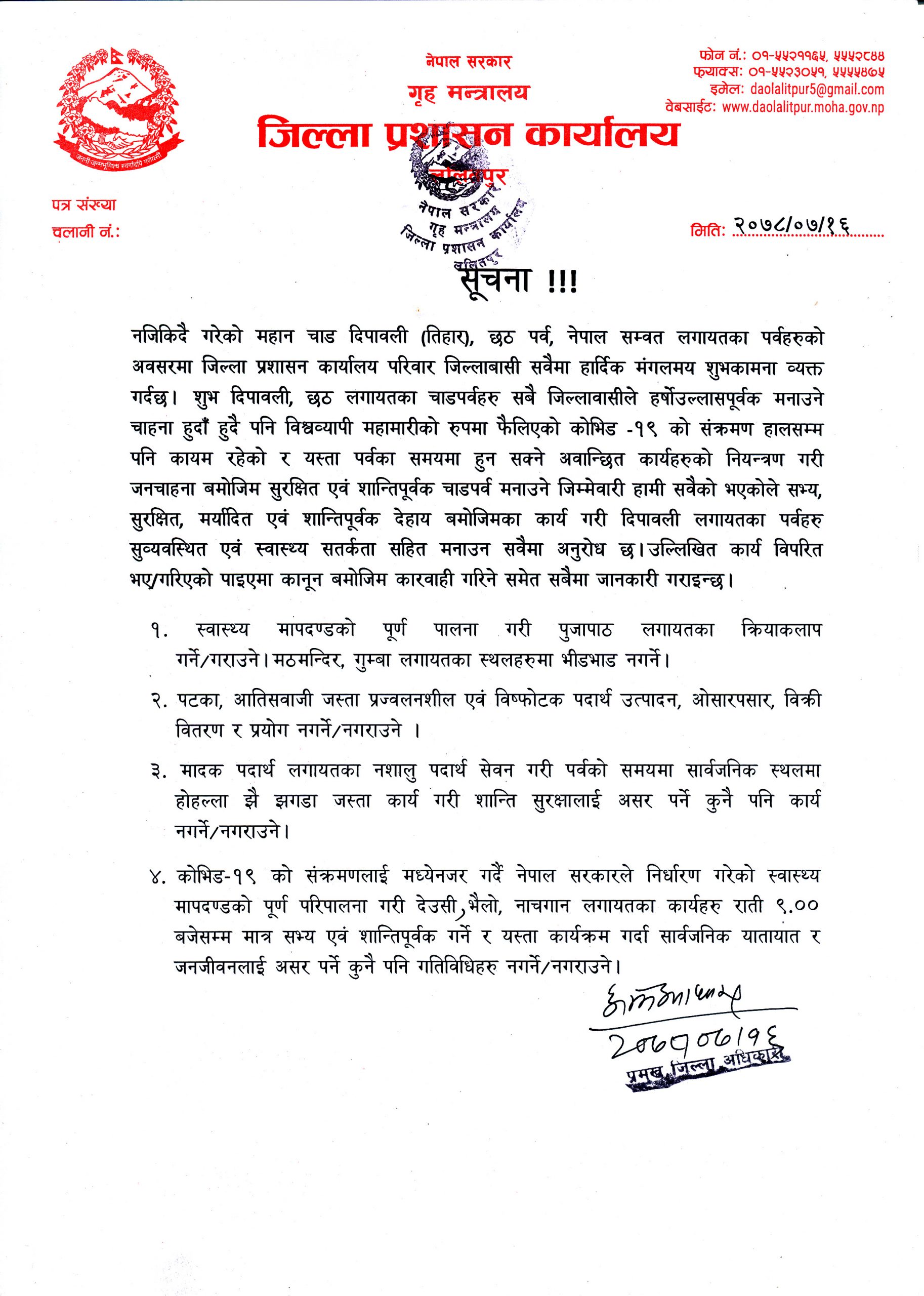 सूचना अनुसार तिहारमा देउसीभैलो, नाचगान लगायतका कार्य राति ९ बजेसम्म मात्र सभ्य एवम् शान्तिपूर्वक गर्न र त्यस्ता कार्य गर्दा सार्वजनिक यातायात र जनजीवनलाई असर पर्ने गरी कुनै गतिविधि नगर्न र नगराउन अनुरोध गरिएको छ। पटका, आतिसवाजी जस्ता प्रज्वलनशील एवम् विष्पोटक पदार्थ उत्पादन, ओसारपसार, बिक्री वितरण र प्रयोग नगर्न भनिएको छ।