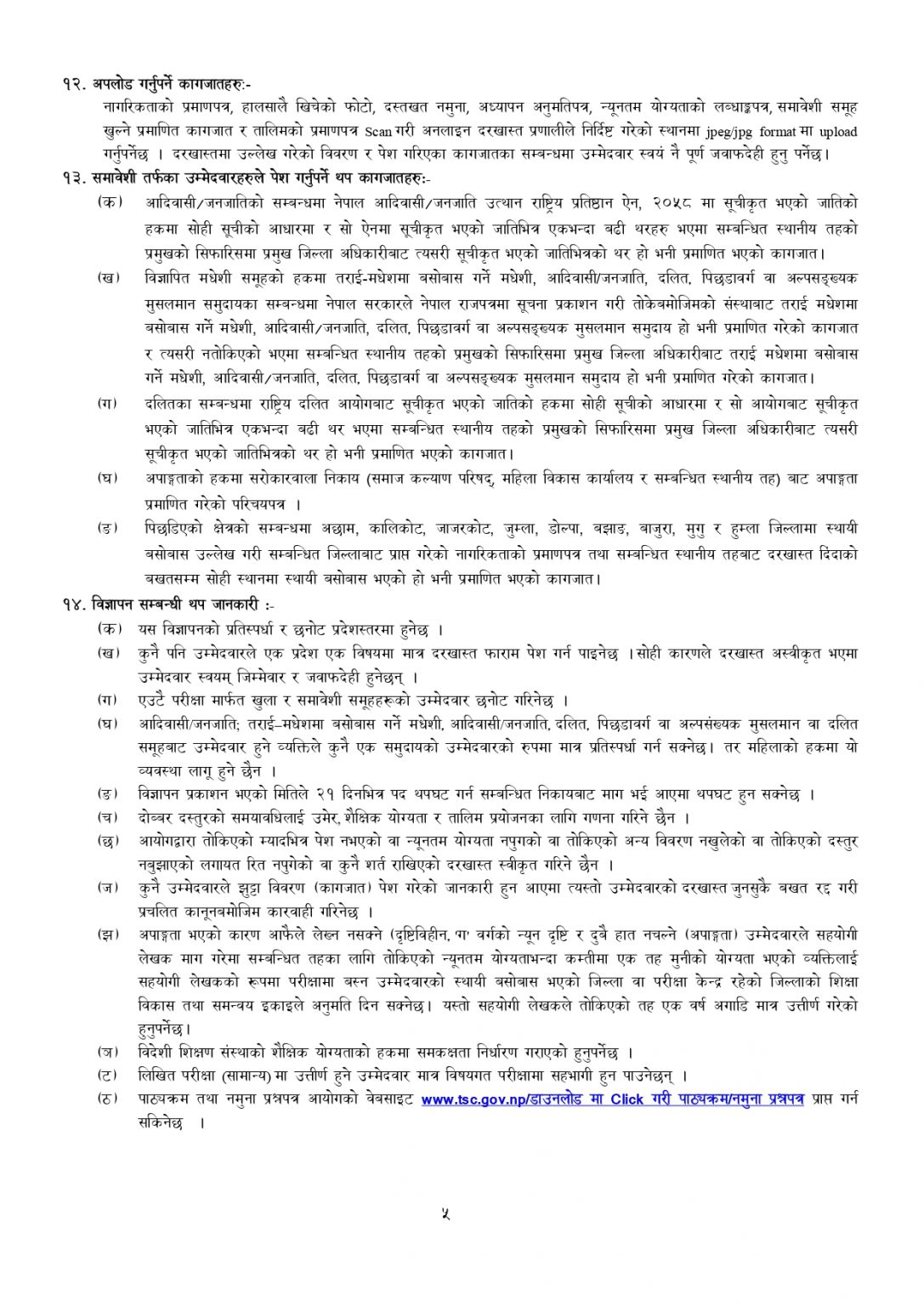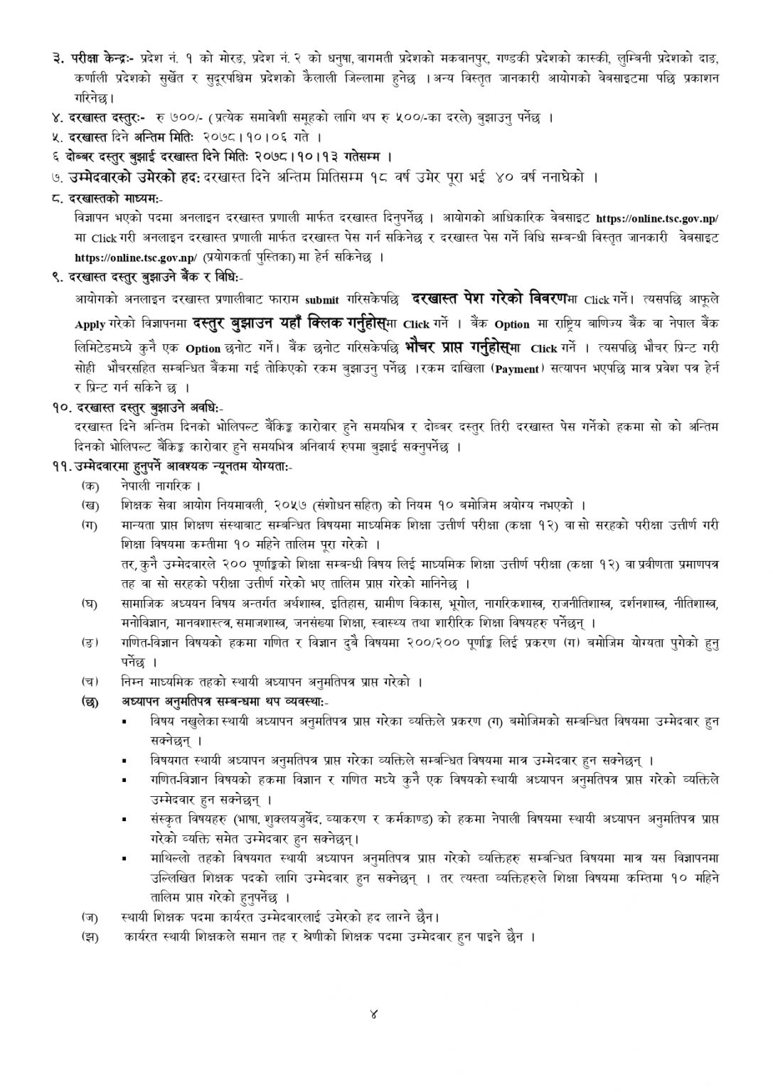 इच्छुक उम्मेदवारले माघको ६ गतेसम्म तोकिएको दस्तुरमा र माघ ७ देखि १३ गतेसम्म दोब्बर दस्तुर तिरेर आवेदन दिन सक्ने आयोगले जनाएको छ । आयोगले माध्यमिक तहमा मंसिर २९ गते नै विज्ञापन खुलाइसकेको छ ।