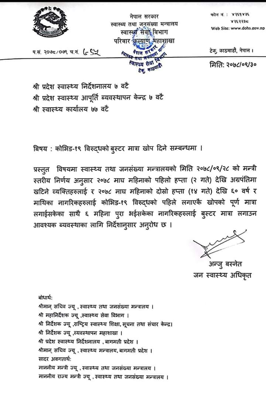 स्वास्थ्य तथा जनसंख्या मन्त्रालयले प्रदेशका स्वास्थ्य निर्देशनालय र जिल्ला स्वास्थ्य कार्यालयहरुलाई पत्र लेखेर आजदेखि अग्रपंत्तिमा खटिनेहरुलाई बुस्टर डोज दिन भनेको छ । मन्त्रालयका अनुसार ६० वर्षमाथिका ज्येष्ठ नागरिकलाई माघ १४ गतेदेखि बुस्टर डोज दिइनेछ ।