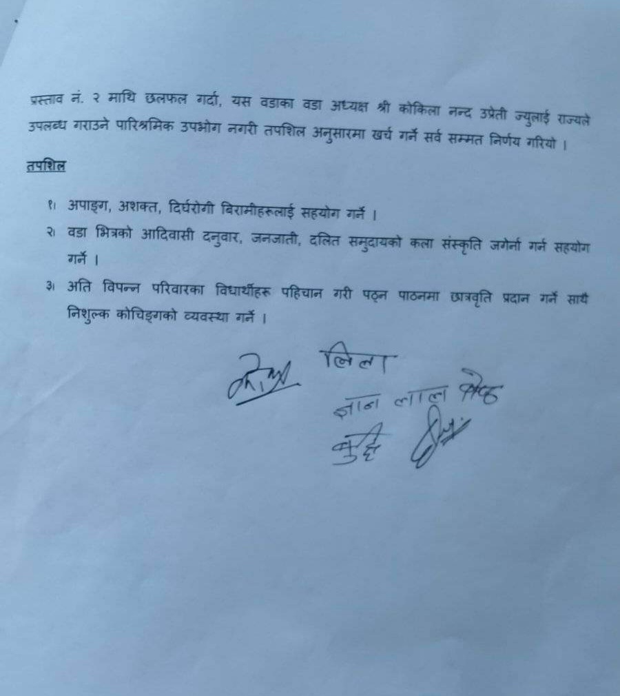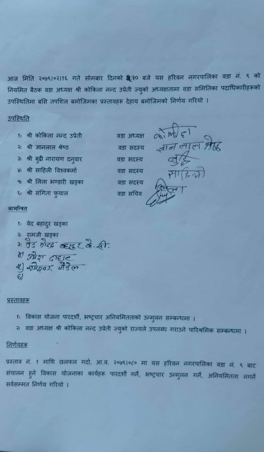 सर्लाही हरिवन नगरपालिका वडा नं ९ का हालै नेपाली कांग्रेस बाट निर्वाचित वडा अध्यक्ष कोकिलानन्द उप्रेती तथा एमाले बाट निर्वाचित ४ जना वडा सदस्यहरुको पदभार ग्रहण तथा पहिलो वैठक हिजो बस्यो। साथै हिजोको पहिलो वैठकबाट वडा अध्यक्ष कोकिलानन्द उप्रेतीले आफुले कुनैपनी तलब भत्ता तथा सुविधा नलिने घोषणा गरेका छन। उनले उक्त तलब सुविधाको रकम वडामा रहेका अशक्त अपांग तथा अल्पसंख्यक समुदायलाई आवश्यक सहयोग गर्नु पर्ने क्षेत्रहरुमा खर्च गर्ने निर्णय गरेका छन। उनले अर्को एक निर्णय गर्दै भ्रस्टाचारमा शून्य सहनसिलता अपनाइने र आफ्नो वडा समिती बाट त्यस्ता कुनै पनि भ्रष्टाचार जन्य गतिविधि हुन नदिने र नगर्ने तथा विकास आयोजनाका कार्यहरु पारदर्शी ढंगले संचालन गर्ने निर्णय गरेका छन। कार्यक्रम मा वडा सदस्यहरु बुद्धिनारायण दनुवार, ज्ञानलाल श्रेष्ठ, सांहिली विश्वकर्मा, लिला भन्डारी खड्का , वडा सचिव संगिता फुयाँल लगायत कर्मचारी तथा वडाका अगुवा व्यक्तित्वहरुको उपस्थिति रहेको थियो हेर्नुहोस तस्विरमा