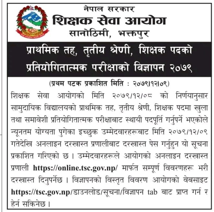 शिक्षक सेवा आयोगले प्राथमिक तहका शिक्षक पदपूर्तिका लागि विज्ञापन खुलाएको छ। आयोगले आज बिहीबार प्रावि तहमा विज्ञापन खुलाएको हो । आयोगले एक सूचना जारी गर्दै चैत ८ गतेको निर्णय अनुसार आजदेखि दरखास्त पेस गर्न सकिने जनाएको छ ।