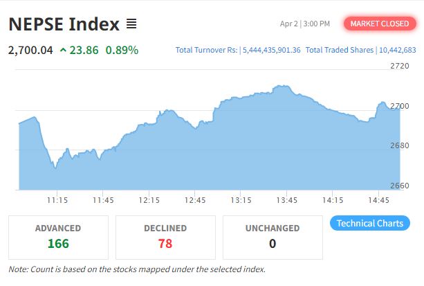 काठमाडौं । नेपाल स्टक एक्सचेञ्ज (नेप्से) परिसूचकमा दोहोरो अङ्कको वृद्धि देखिएको छ । आज नेप्से परिसूचक २३ दशमलव ८६ अङ्कले बढेर दुई हजार सात सय दशमलव शून्य चारको बिन्दुमा कायम भएको हो ।