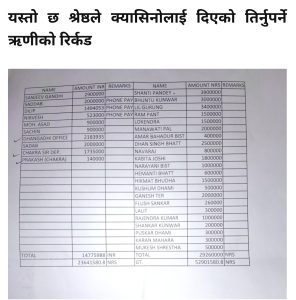 यस्तो छ श्रेष्ठले क्यासिनोलाई दिएको तिर्नुपर्ने ऋणीको रिर्कड