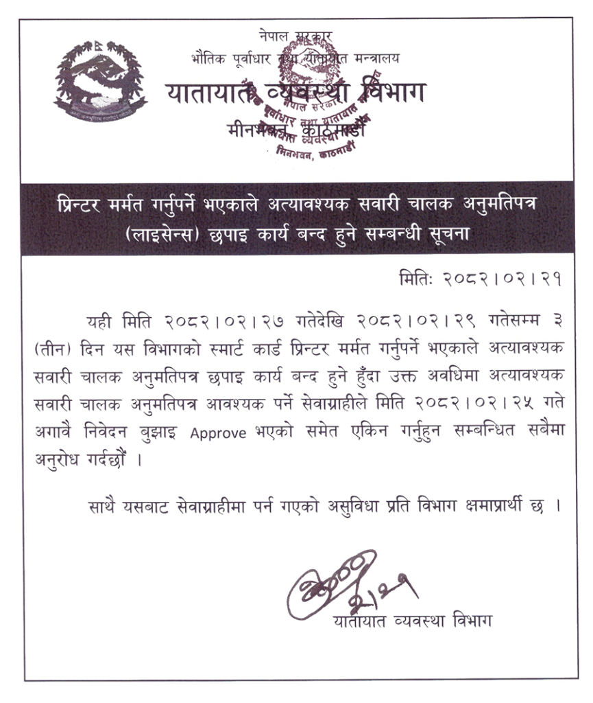 सवारी चालक अनुमतिपत्र (लाइसेन्स) छपाइ कार्य तीन दिन बन्द हुने भएको छ थप यता