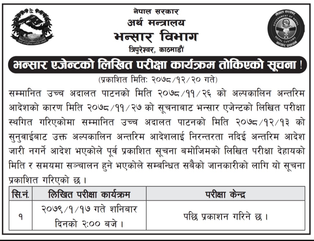 पटक–पटक रोकिँदै आएको भन्सार एजेन्टको परिक्षा आगामी वर्षको वैशाखमा हुने थप यता